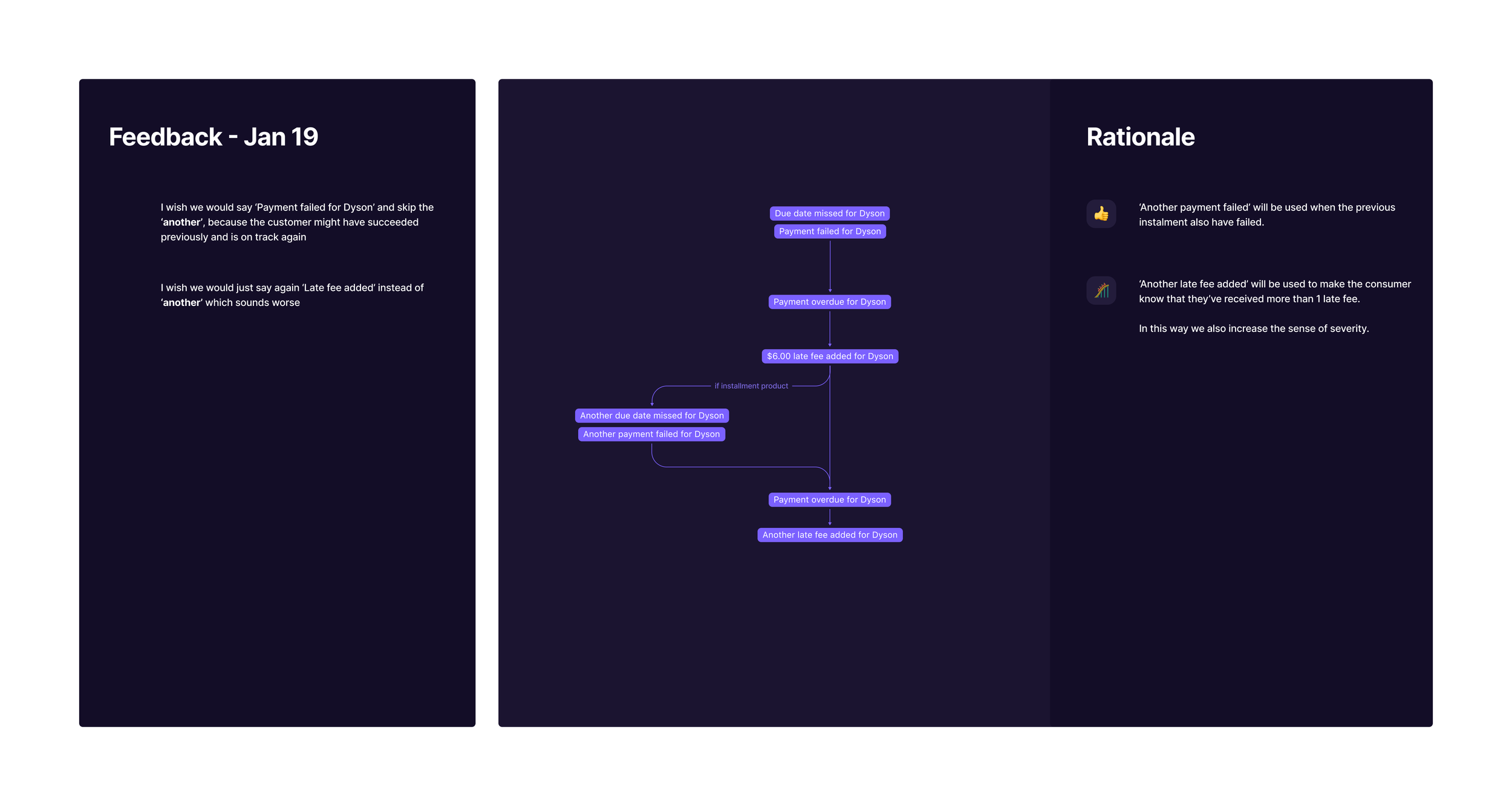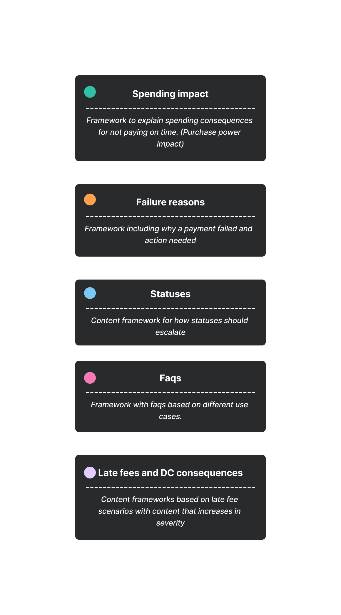 I was a part of the team working on the new post-purchase vision. As a part of that workstream, we aimed to develop a plug-n-play design system and content framework for transactional emails. This would help us align the experience that our customers had across our core products: Pay in 4, Pay in 30 days, and Financing.