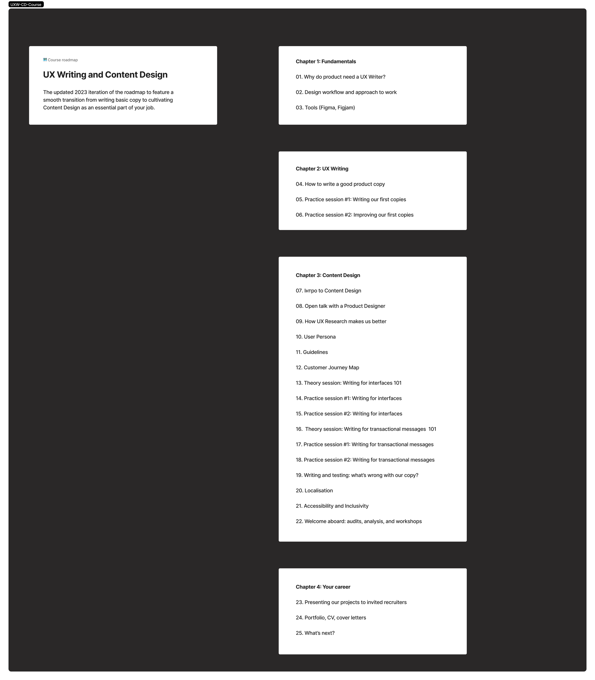 While the first group of students faced a more of a fast-paced course to help them kickstart their career, my latest course focuses more on strong Content Design expertise and becoming an independent writer who can have deliver complex UX solutions.